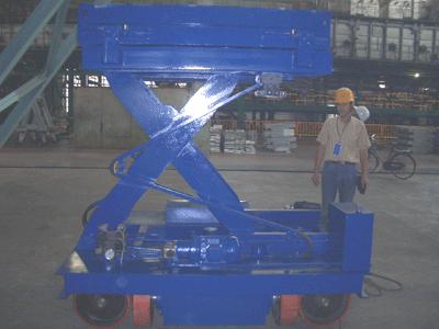 該設(shè)備應(yīng)用于攀鋼1250熱鍍鋅生產(chǎn)線連退火爐底蓋的維修更換。設(shè)備載重量3000公斤,可在負(fù)載狀態(tài)下縱橫兩個(gè)方向電動行走,起升高度2209,工作臺可前后左右電動液壓微調(diào)150mm。