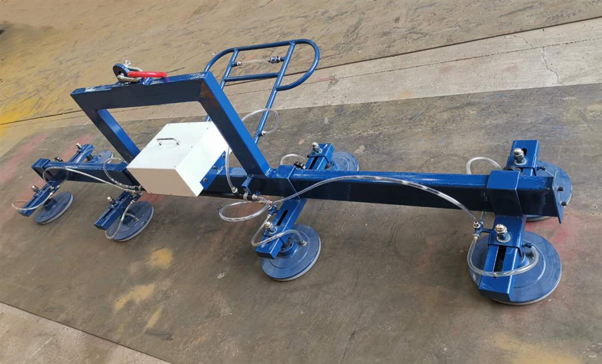 該應用實例吸吊重量1500Kg,8只吸盤頭,每只直徑260mm,吸吊鋼材6m*2m,蓄電池型號